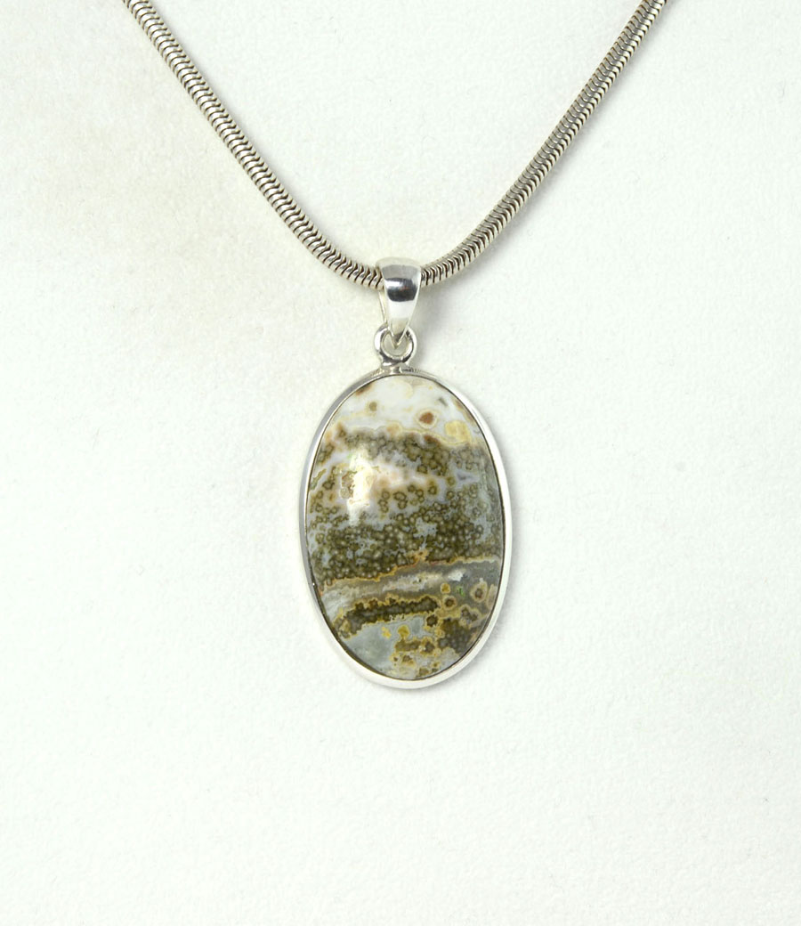 Großer Ozean-Chalcedon-Anhänger, mit kräftigen Beige- und Grüntönen und individueller Zeichnung. Der ovale Stein ist als Cabochon eingefasst in Sterling Silber. Dieser Ozean-Chalcedon-Anhänger ist ein Unikat.