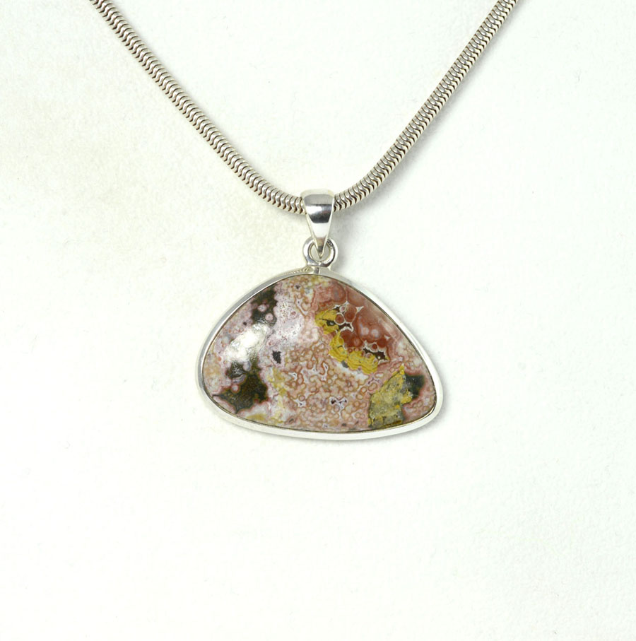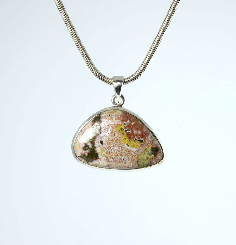 Großer Ozean-Chalcedon-Anhänger mit lebendiger Zeichnung in Lachs-, Beige- und Grüntönen. Der in freier Form geschliffene Cabochon ist in Sterling Silber gefasst. Dieser Ozean-Chalcedon-Anhänger ist ein Unikat.