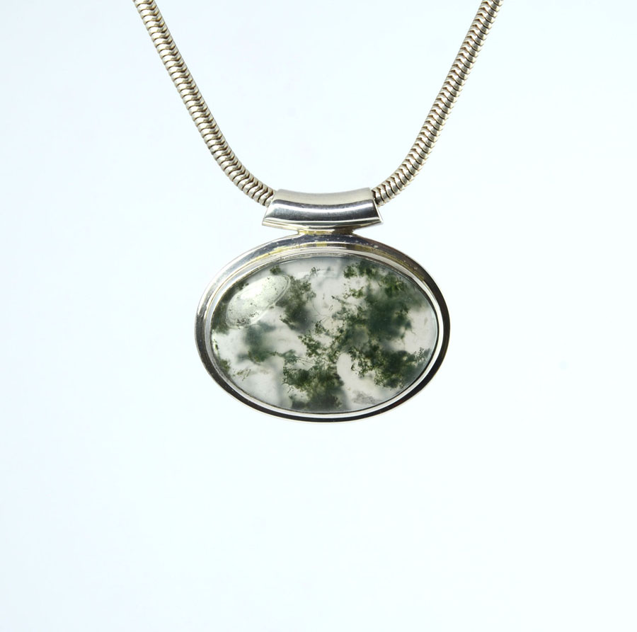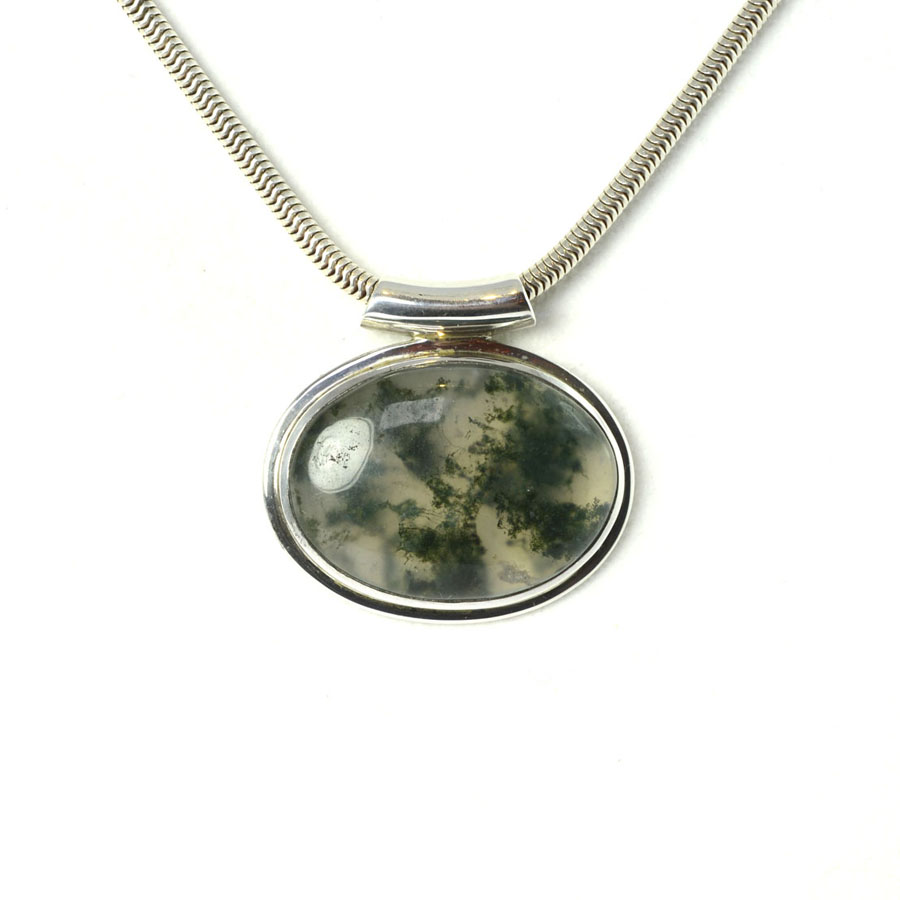 Grosser, fein gezeichneter und durchscheinender Moosachat-Anhänger mit ovalem Cabochon. Der Stein ist quer eingefasst in Sterling Silber. Dieser Moosachat-Anhänger ist ein Unikat.