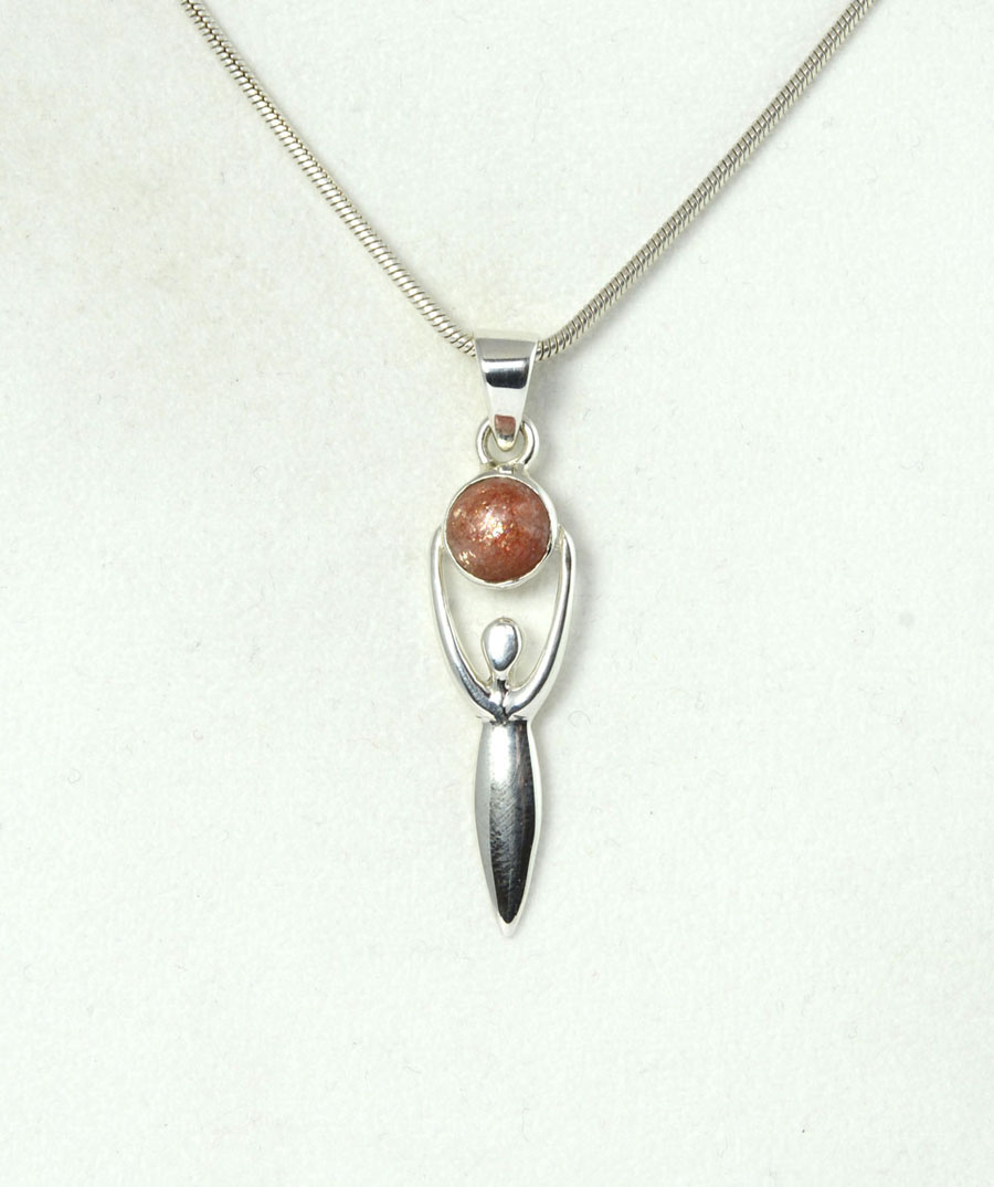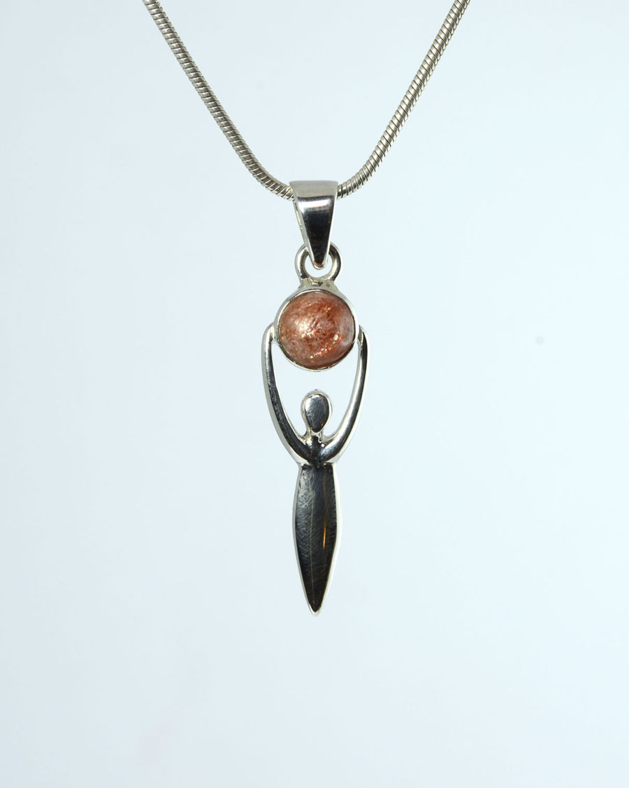 Sehr weiblich: Göttinnen-Anhänger mit kupfer-golden schimmerndem Sonnenstein-Cabochon, eingefasst in Sterling Silber. Dieser Sonnenstein-Anhänger ist ein Unikat.