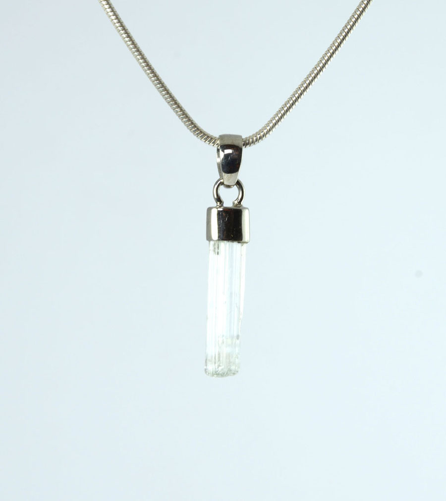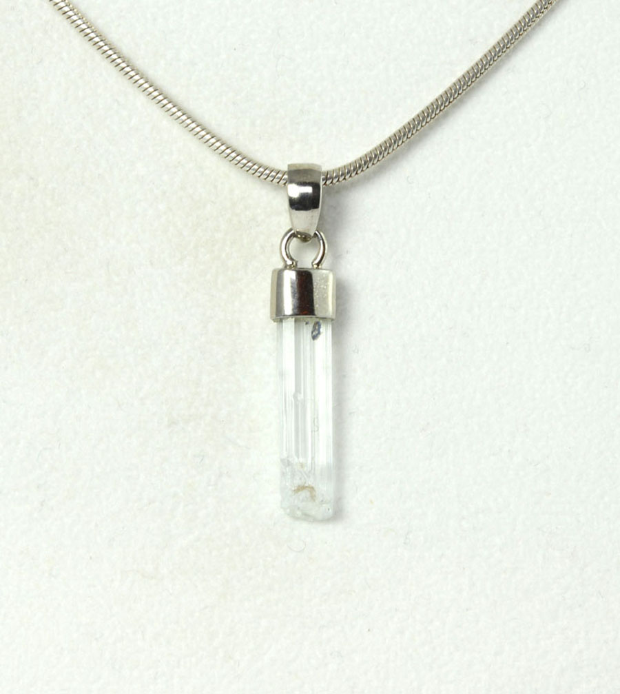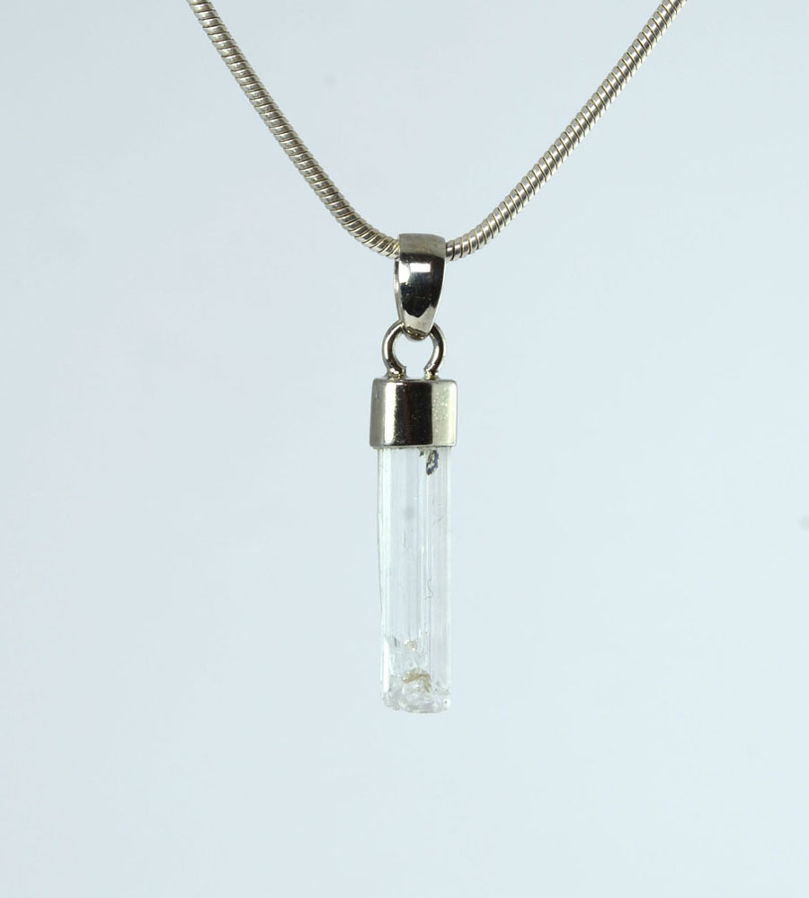 Zierlicher, farblos klarer Goshenit-Anhänger mit feinem, lämglichem Kristall Der Stein ist mit einer Kappe in Sterling-Silber eingefasst. Dieser Goshenit-Anhänger ist ein Unikat.