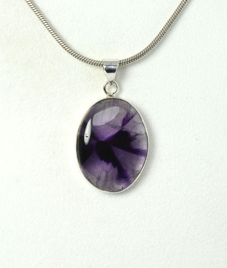 Kräftig violetter Amethyst-Anhänger mit ausgefallenen, blütenblattförmigen Strukturen. Der Amethyst ist als ovaler Cabochon in Sterling Silber gefasst. Dieser Amethyst-Anhänger ist ein Unikat.