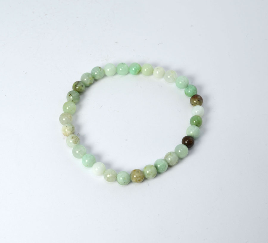 Chrysopras-Armband aus Kugeln mit 6 mm Durchmesser mit pastellig grüner Farbe. Die Steine sind auf einem robusten, elastischen Band aufgezogen - dadurch lässt sich das Armband bequem über das Handgelenk streifen.