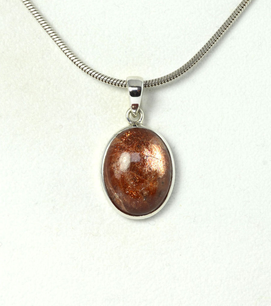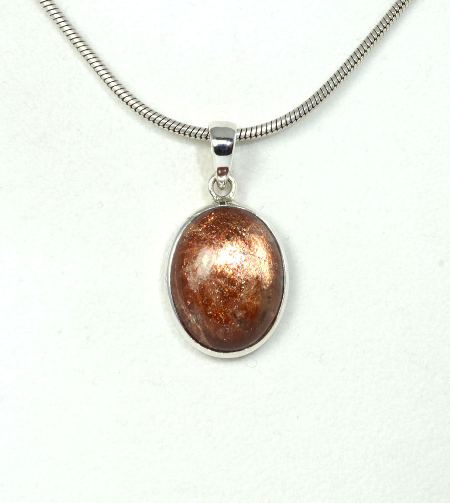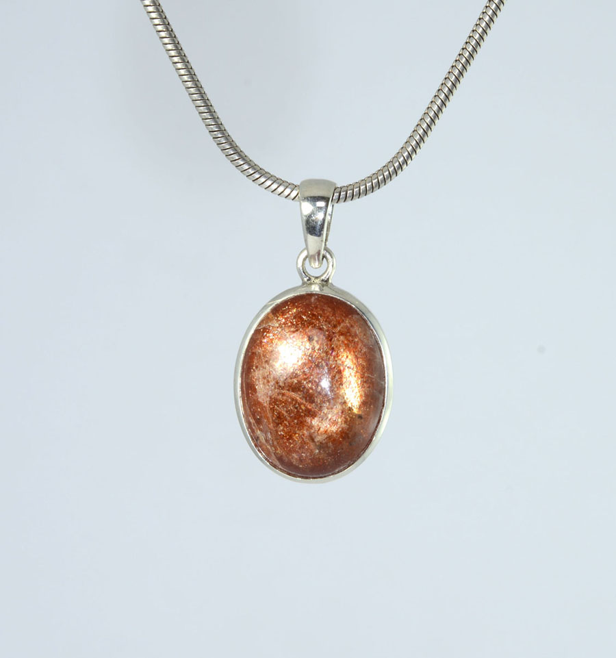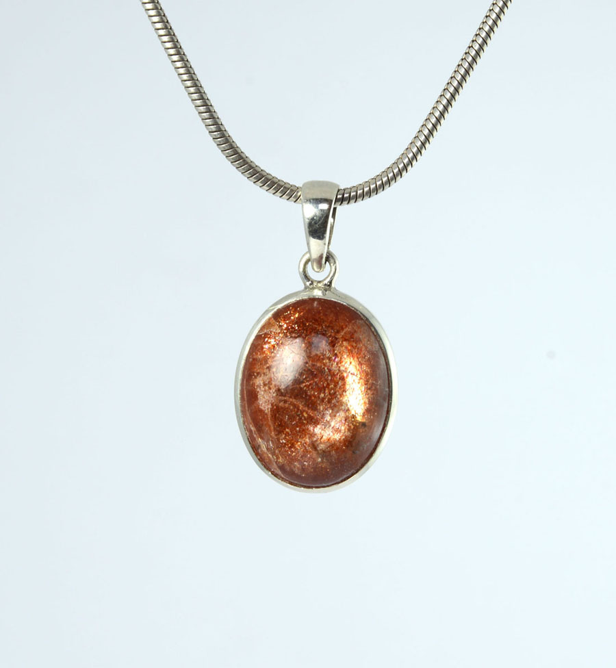 Feiner Sonnenstein-Anhänger mit intensiv gold bis kupferfarben leuchtendem Cabochon. Der ovale Stein ist in Sterling Silber eingefasst. Dieser Sonnenstein-Anhänger ist ein Unikat.