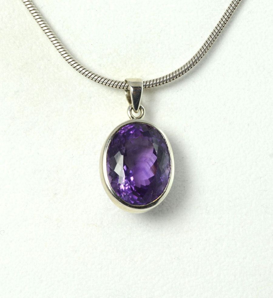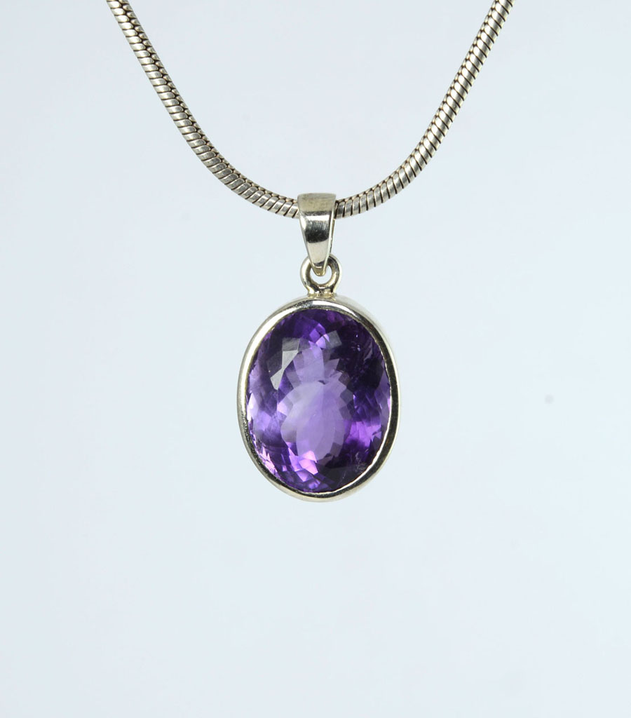 Mittelgroßer, dunkelvioletter Amethyst-Anhänger mit ovalem Stein. Der Amethyst ist facettiert geschliffen und in Sterling Silber gefasst. Der Stein ist sehr klar und hat eine leuchtend violette Farbe. Dieser Amethyst-Anhänger ist ein Unikat.