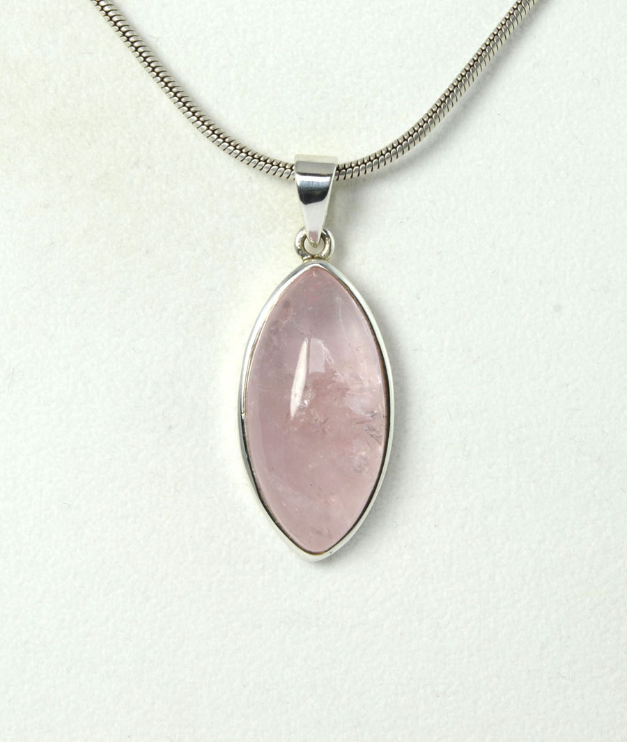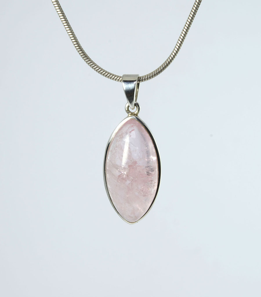 Ausgefallener, intensiv rosa Morganit-Anhänger mit einem navetteförmigen Cabochon, eingefasst in Sterling Silber. Dieser Morganit-Anhänger ist ein Unikat.