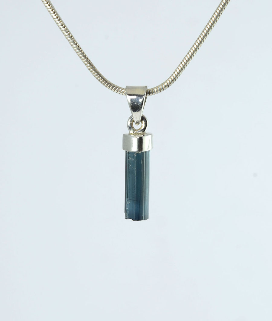 Zierlicher, intensiv blauer Turmalin-Anhänger mit naturbelassenem Kristall. Der Turmalin ist mit einer Kappe in Sterling Silber gefasst. Dieser Indigolith-Anhänger ist ein Unikat.