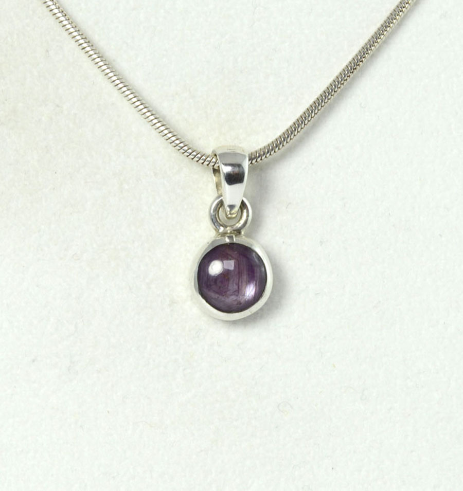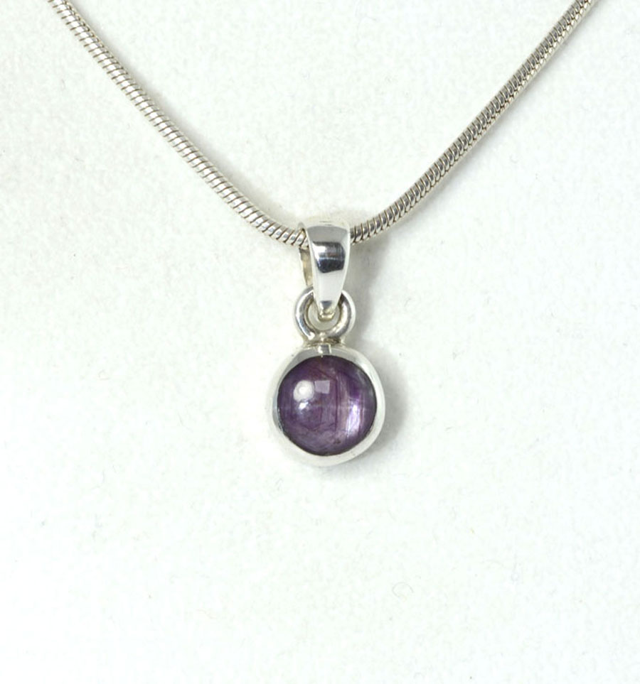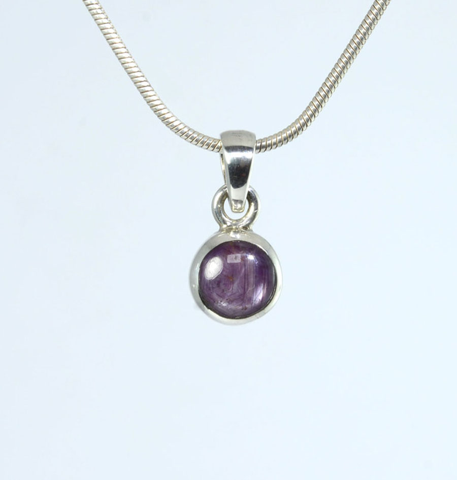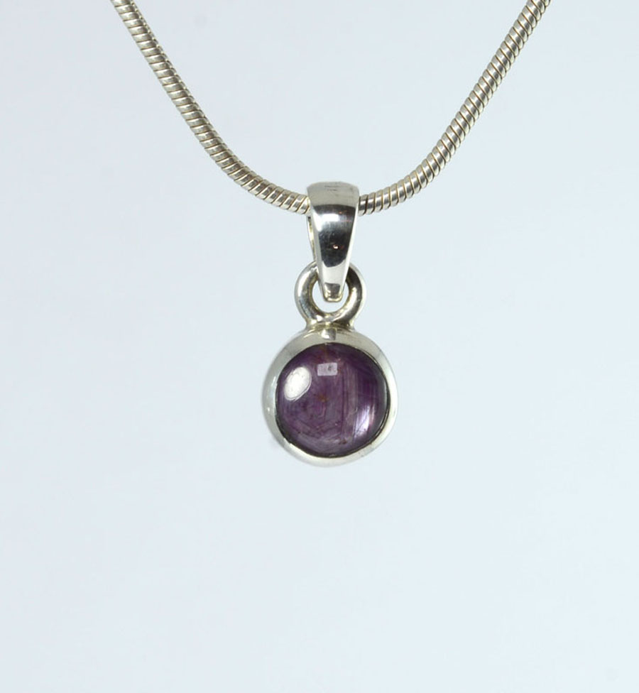 Zierlicher, rot-violetter Stern-Rubin-Anhänger mit rundem Stein, eingefasst in Sterling Silber und mit feinem Sterneffekt. Dieser Stern-Rubin-Anhänger ist ein Unikat.