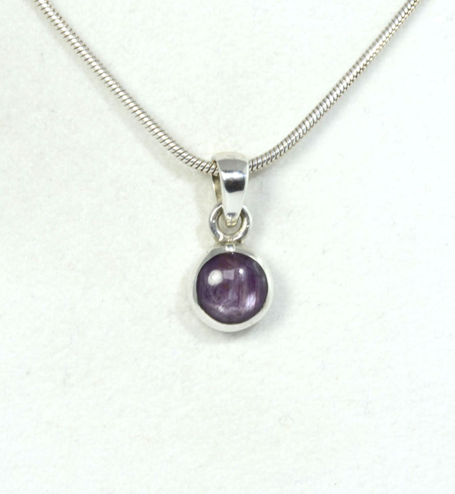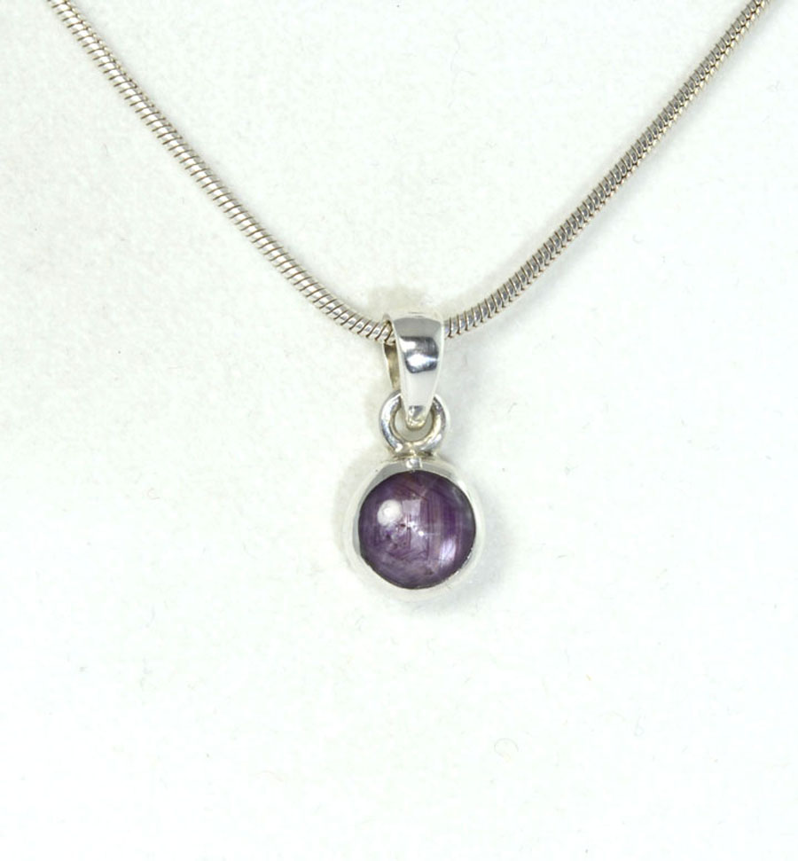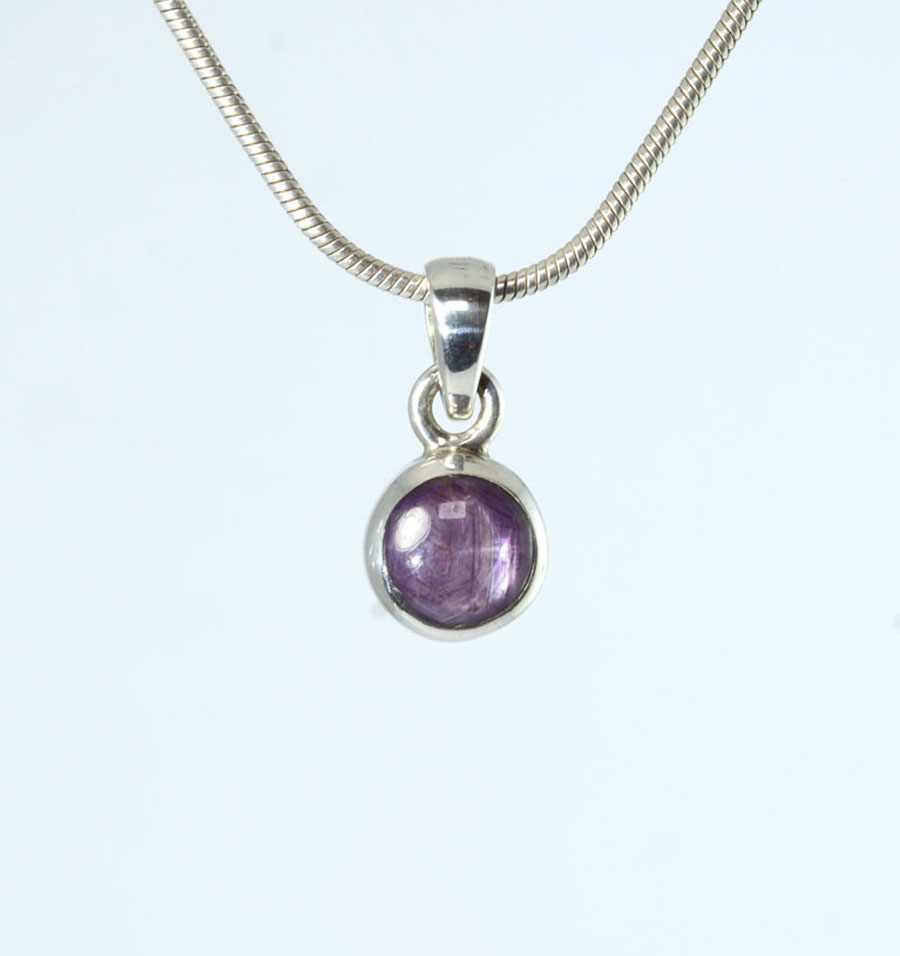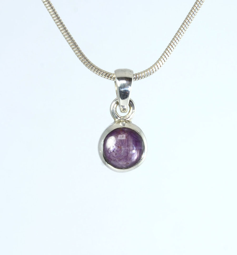 Zierlicher, rot-violetter Stern-Rubin-Anhänger mit rundem Stein, eingefasst in Sterling Silber und mit feinem Sterneffekt. Dieser Stern-Rubin-Anhänger ist ein Unikat.