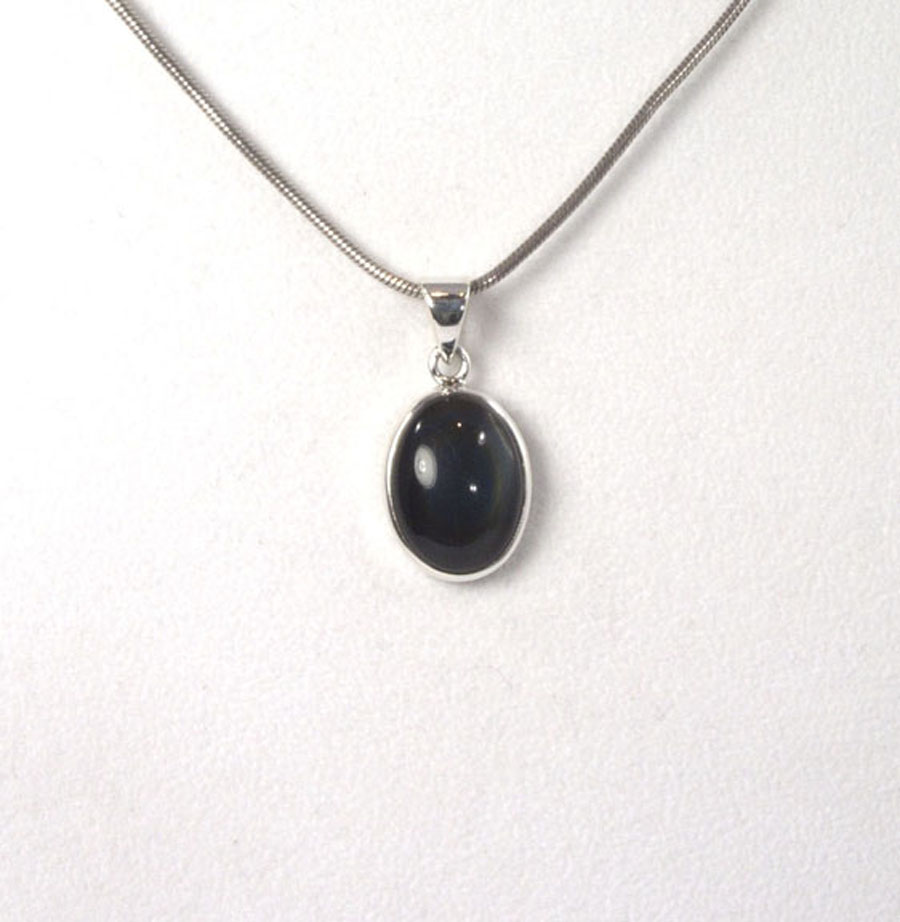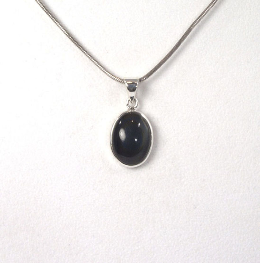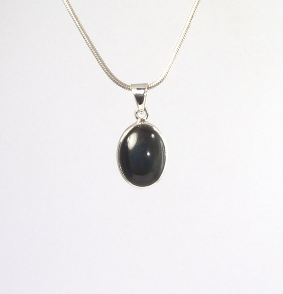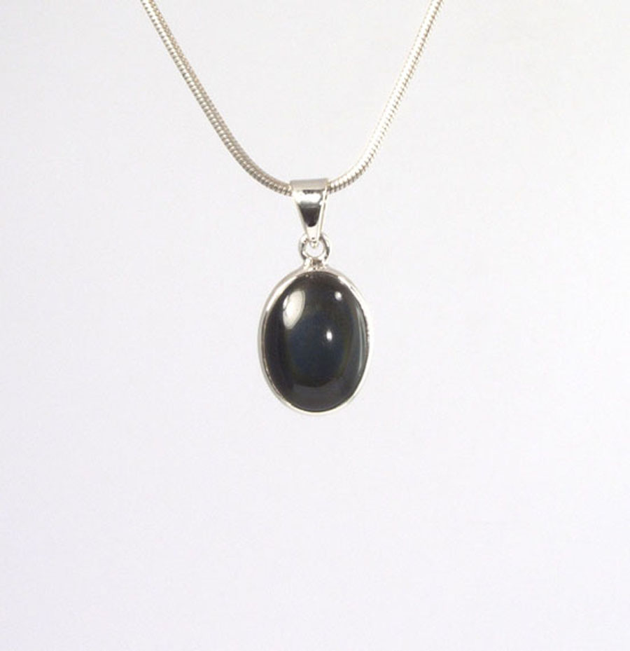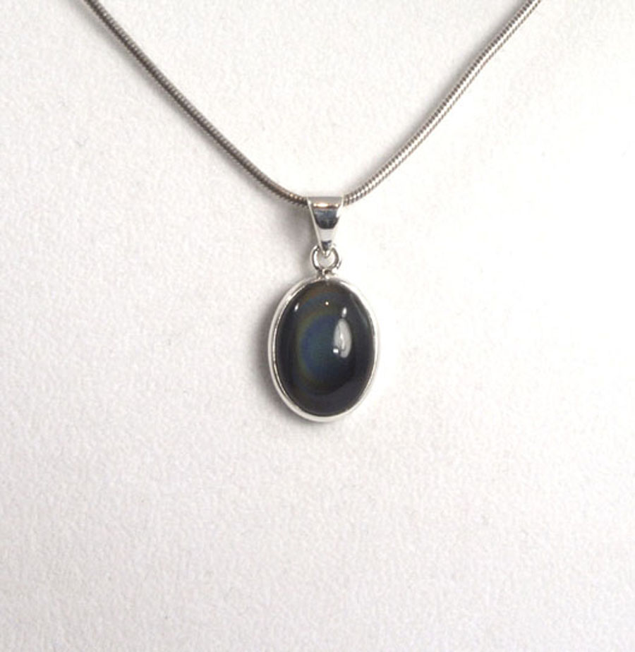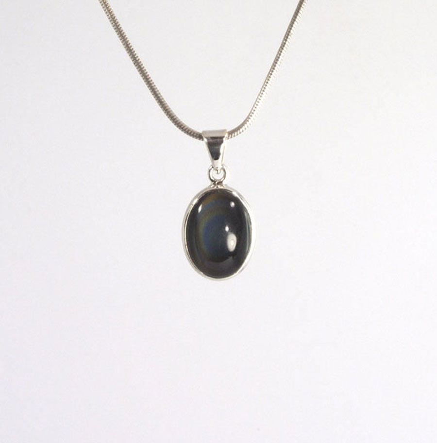 Zierlicher, traumhaft schöner, ovaler Regenbogen-Obsidian-Anhänger mit buntem Schimmer, als Cabochon gefasst in Sterling Silber.