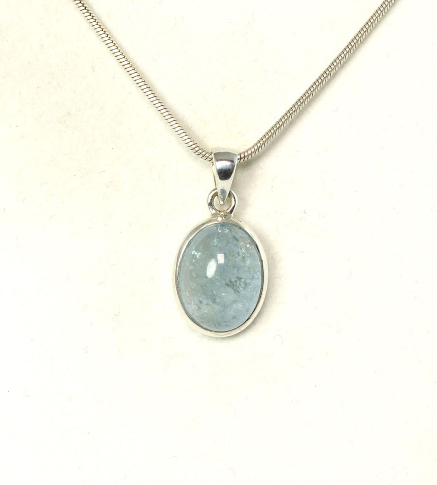 Schöner, milchig blauer Aquamarin-Anhänger mit ovalem Cabochon, mit Zarge eingefasst in Sterling Silber. Dieser Aquamarin-Anhänger ist ein Unikat.