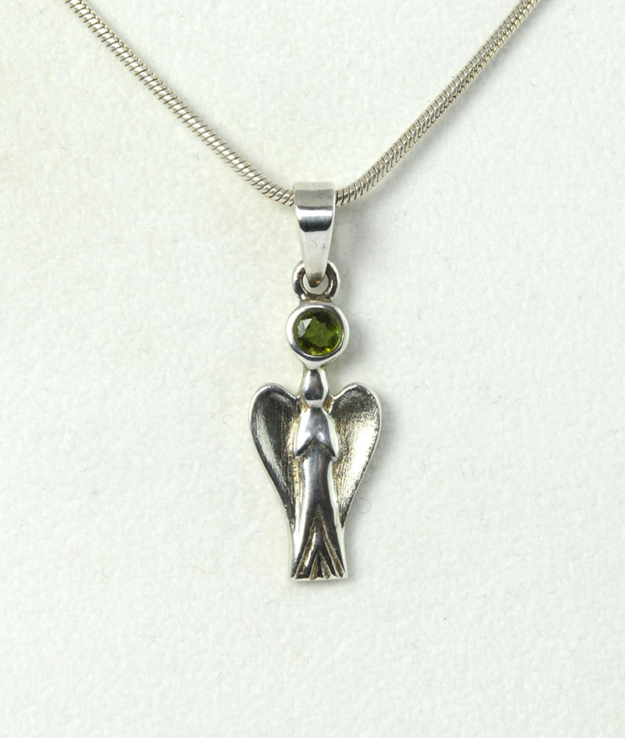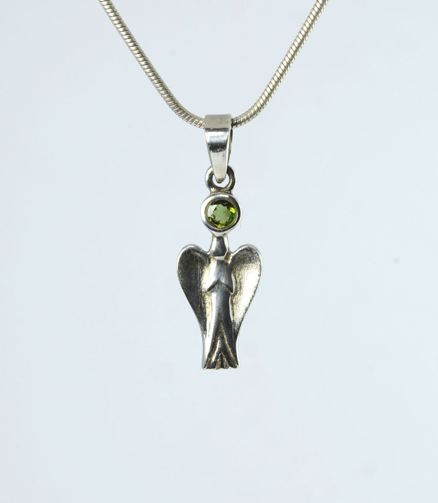 Zierlicher Schutzengel-Anhänger mit einem leuchtend grünen Turmalin der Varietät Verdelith. Der runde, facettierte Stein ist in Sterling Silber gefasst. Dieser Anhänger ist ein Unikat.