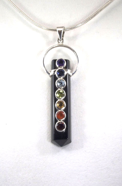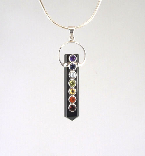 Polierte Schörl-Spitze als Anhänger mit den Steinen der 7 Chakren in Sterling Silber.