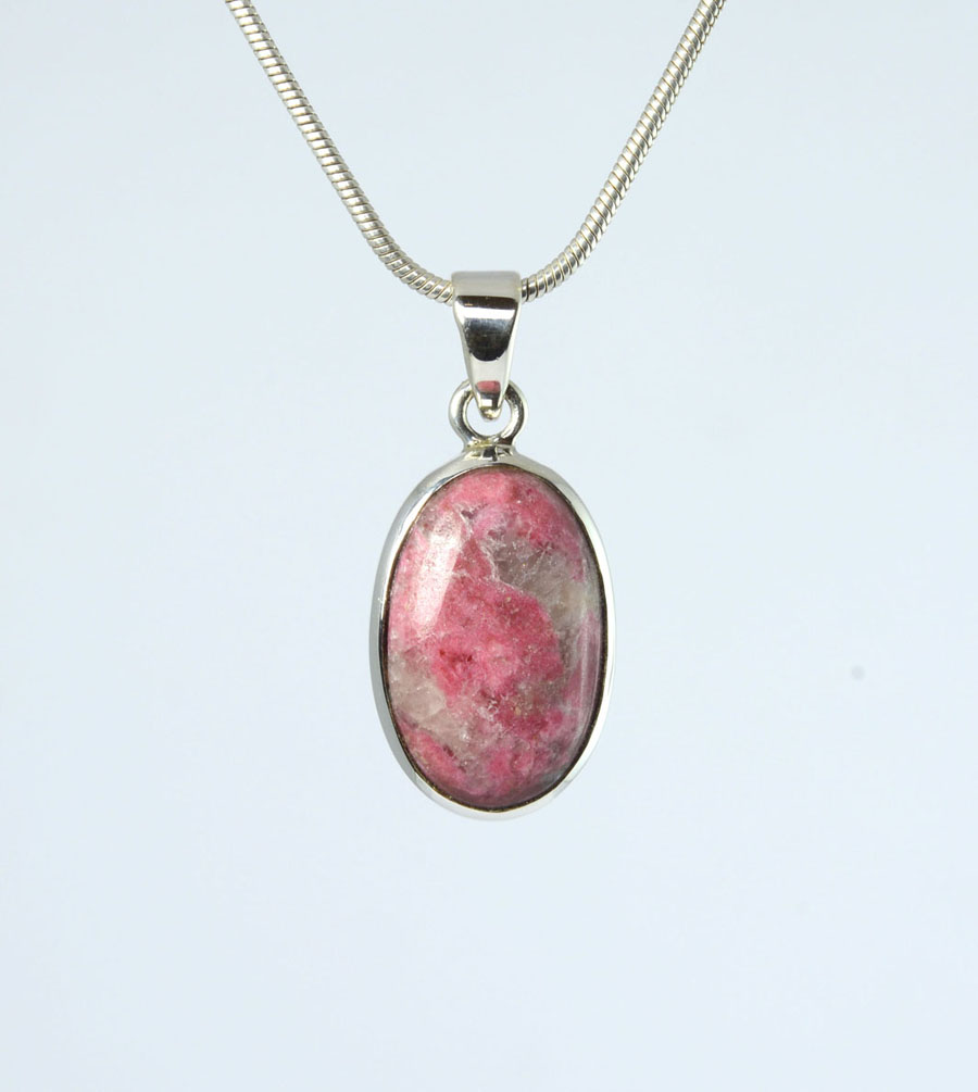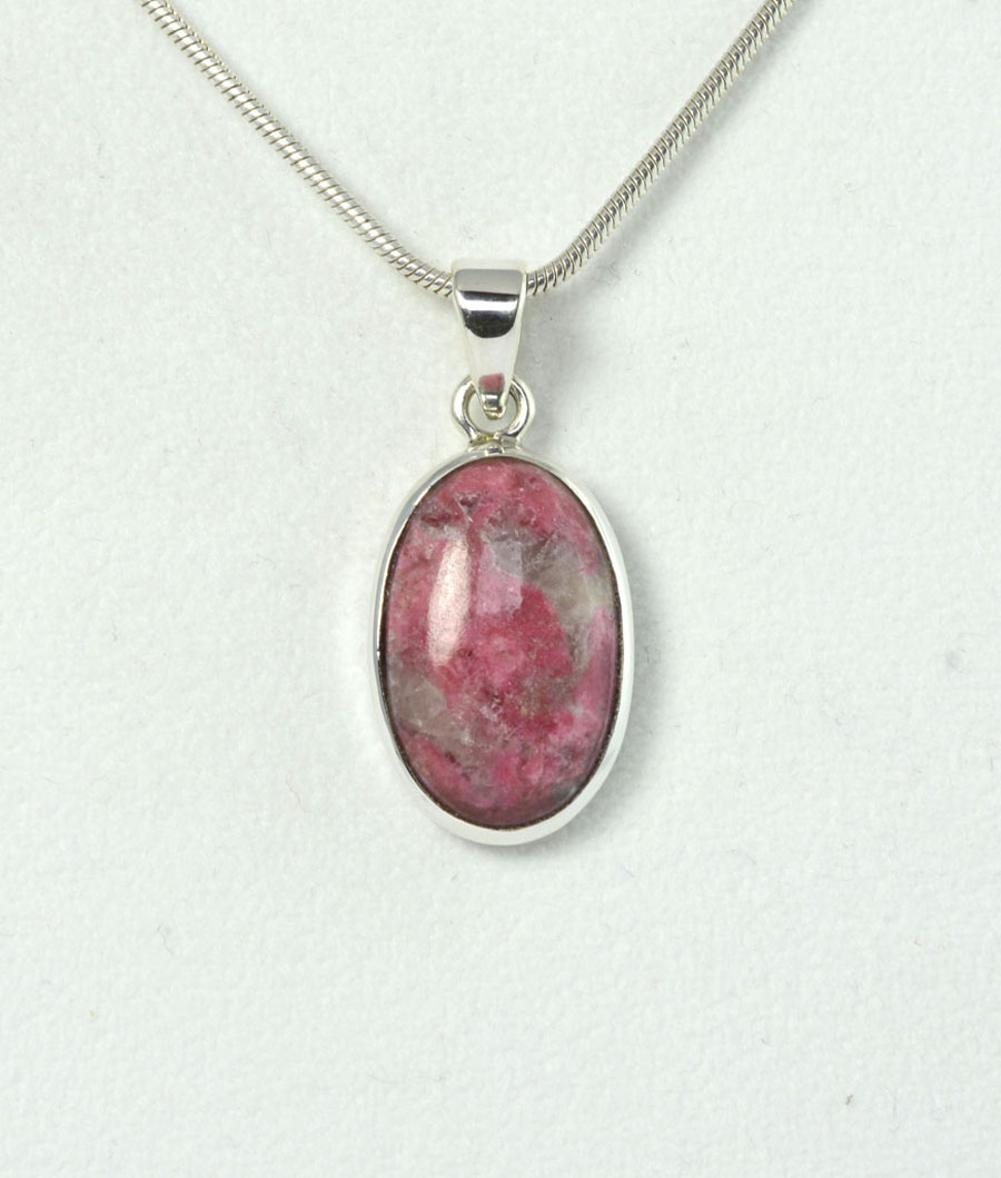 Thulit-Anhänger mit intensiv rosa Farbe und lebendiger Zeichnung. Der ovale Cabochon ist in Sterling-Silber gefasst. Dieser Thulit-Anhänger ist ein Unikat.
