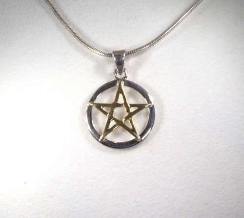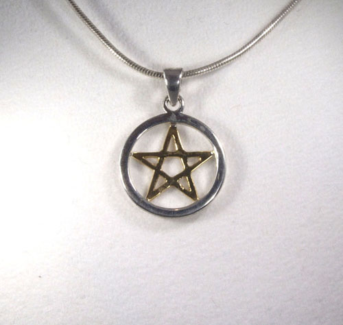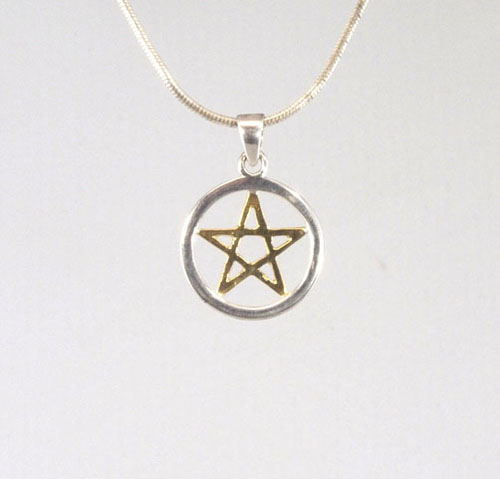 Filigran gearbeiteter Anhänger Pentagramm in Sterling-Silber 925/ooo. Das Pentagramm selbst ist vergoldet und wird von einem Kreis aus Silber umfasst.