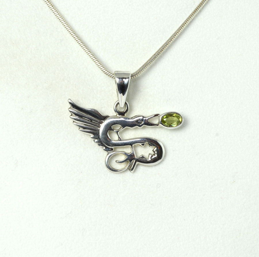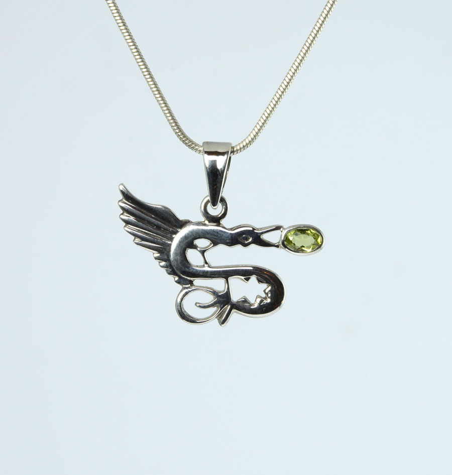 Kleiner Glücksdrache als Anhänger mit einem leuchtend grüner, facettierten Peridot, eingefasst in Sterling Silber. Dieser Peridot-Anhänger ist ein Unikat.