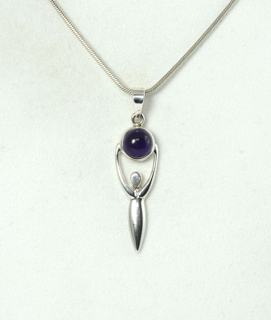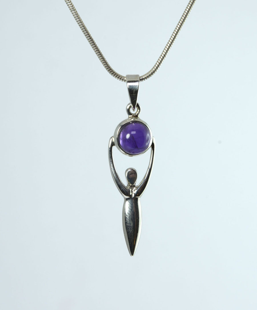 Göttin mit einem runden Amethyst als individueller Anhänger. Der leuchtend violette Cabochin ist in Sterling Silber gefasst.