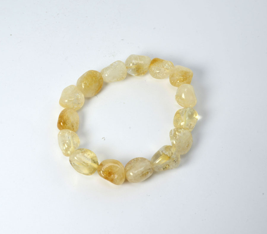 Citrin-Armband aus unregelmäßig geformten Steinen, leuchtend goldgelb mit lebendigen Einschlüssen. Die Steine sind auf einem robusten, elastischen Band aufgezogen - dadurch lässt sich das Armband bequem über das Handgelenk streifen.