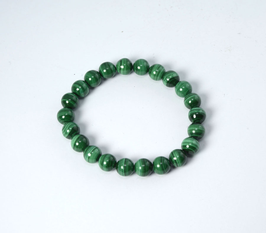 Malachit-Armband aus Kugeln mit ca. 8 mm Durchmesser und kräftig grüner Farbe und feiner Zeichnung. Die Steine sind auf einem robusten, elastischen Band aufgezogen - dadurch lässt sich das Armband bequem über das Handgelenk streifen.
