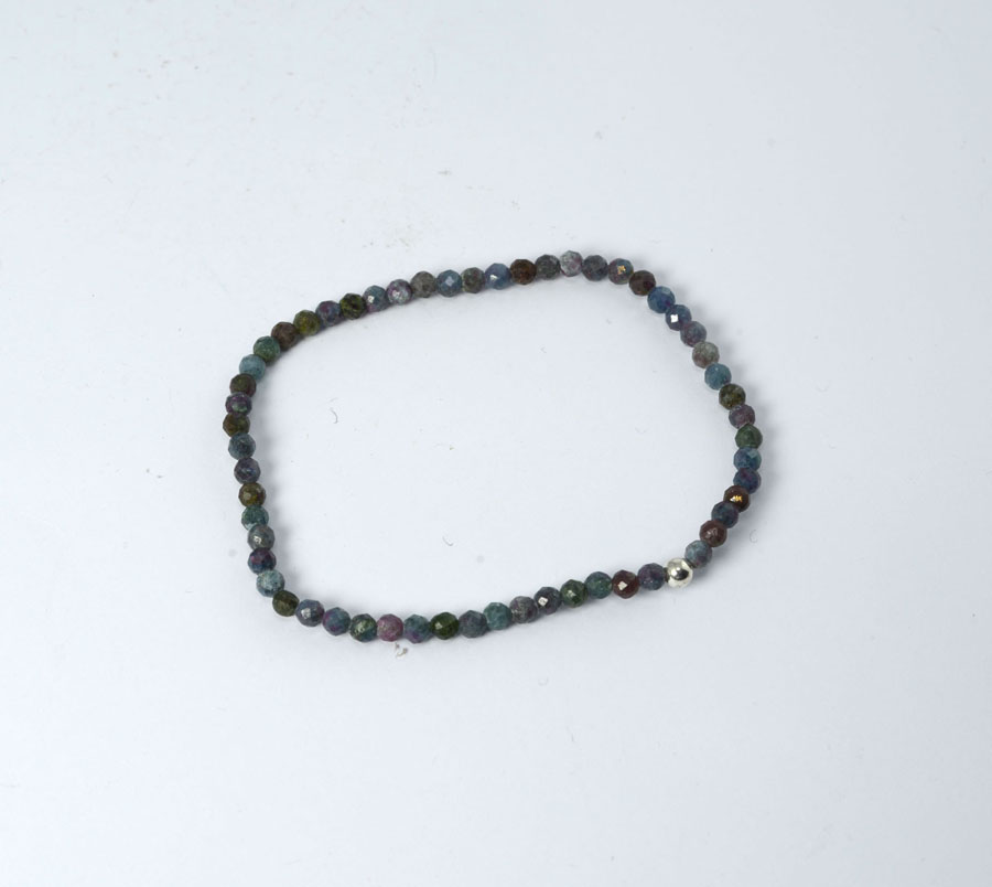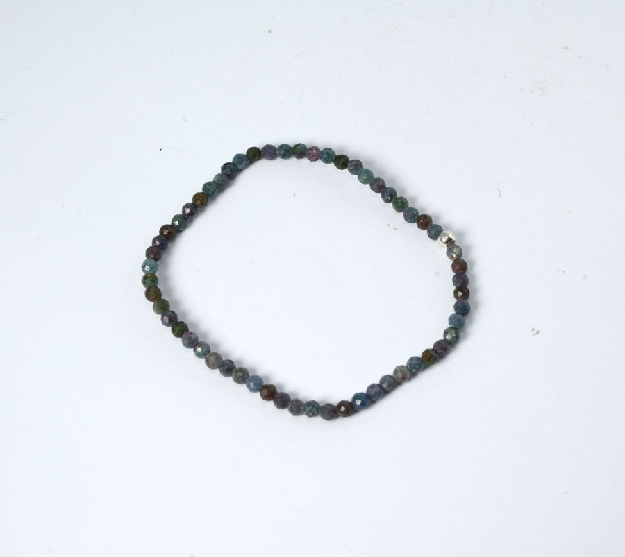 Seltenes Rubin-Disthen-Armband aus Kugeln mit 4 mm Durchmesser. Die dunkelblauen Steine wechseln sich ab mit roten Rubinen und sind facettiert geschliffen. Die Steine sind auf einem robusten, elastischen Band aufgezogen - dadurch lässt sich das Armband bequem über das Handgelenk streifen.
