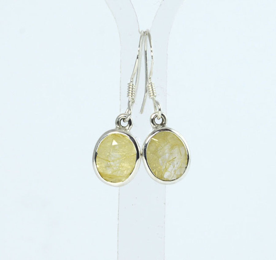 Feine Rutilquarz-Ohrhänger mit ovalen, facettierten Steinen. Die Rutilquarze sind klar und mit feinen, goldgelben Rutilnadeln durchzogen. Die Steine sind in Sterling Silber gefasst. Dieses Paar Ohrhänger ist ein Unikat.