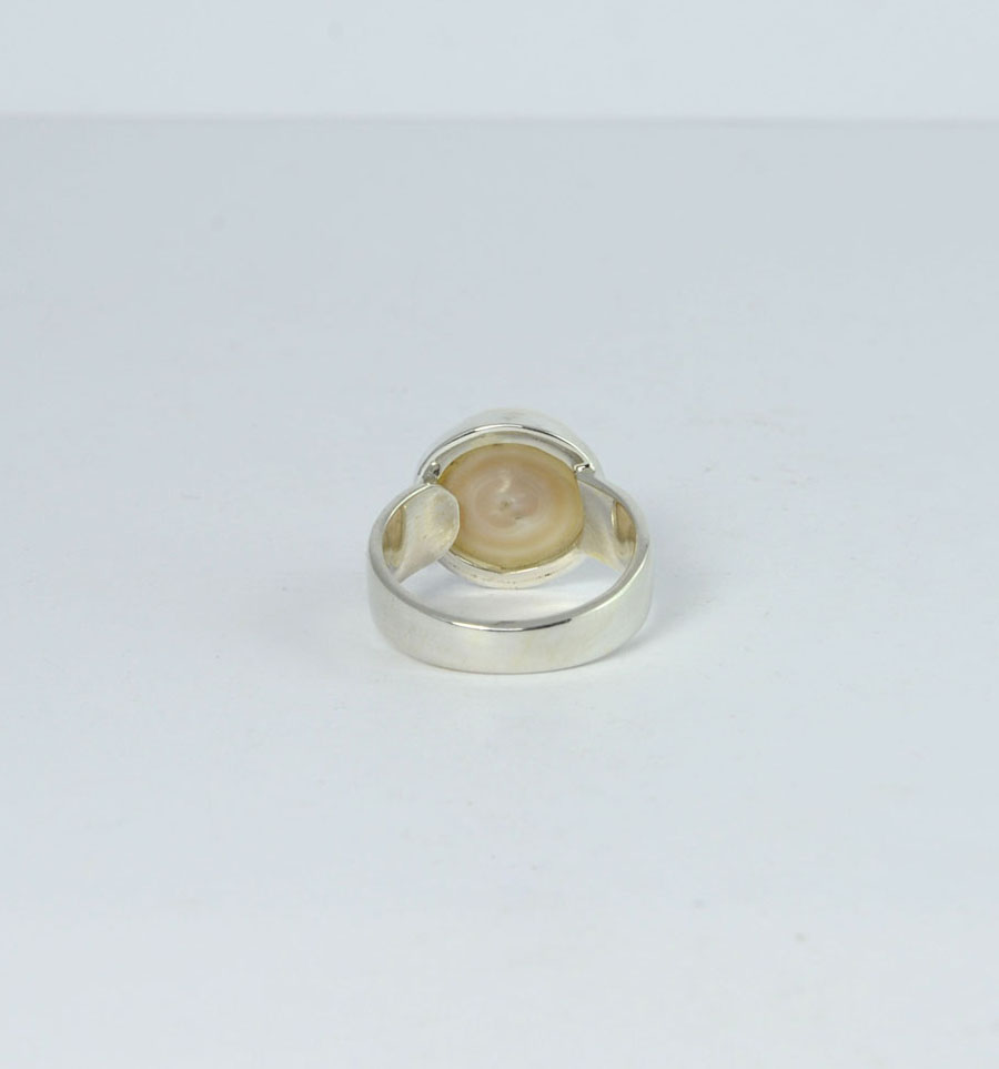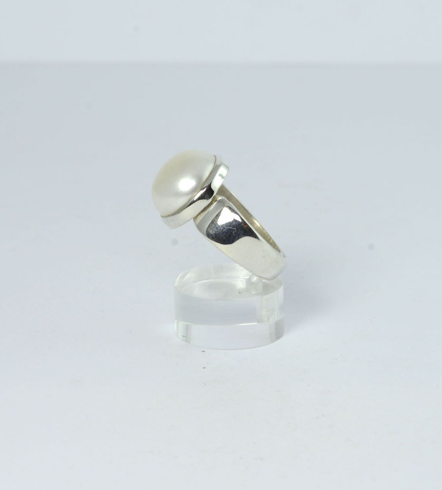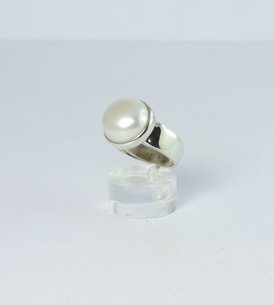 Elegeanter Ring mit einer runden Süßwasser-Perle, gefasst in Sterling Silber. Dieser Perlen-Ring ist ein Unikat.