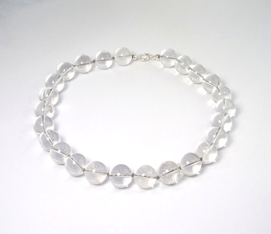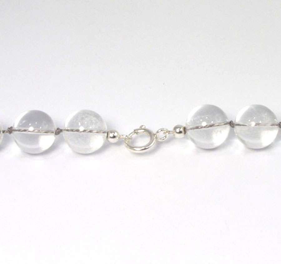 Ausdrucksstarke Bergkristall-Kugelkette mit sehr klaren Kugeln und wenigen Einschlüssen. Der Verschluß ist in Sterling Silber. Die Steine sind einzeln geknotet, wodurch die Kette sich schön um den Hals legt. Diese Bergkristall-Kette ist ein Unikat.