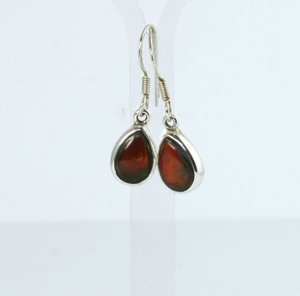 Ausgefallene Ohrhänger mit wunderschönem, in feurig roten Farben schillernden, tropfenförmigen Ammolithen, gefasst in Sterling Silber. Dieses Paar Ammolith-Ohrhänger ist ein Unikat.