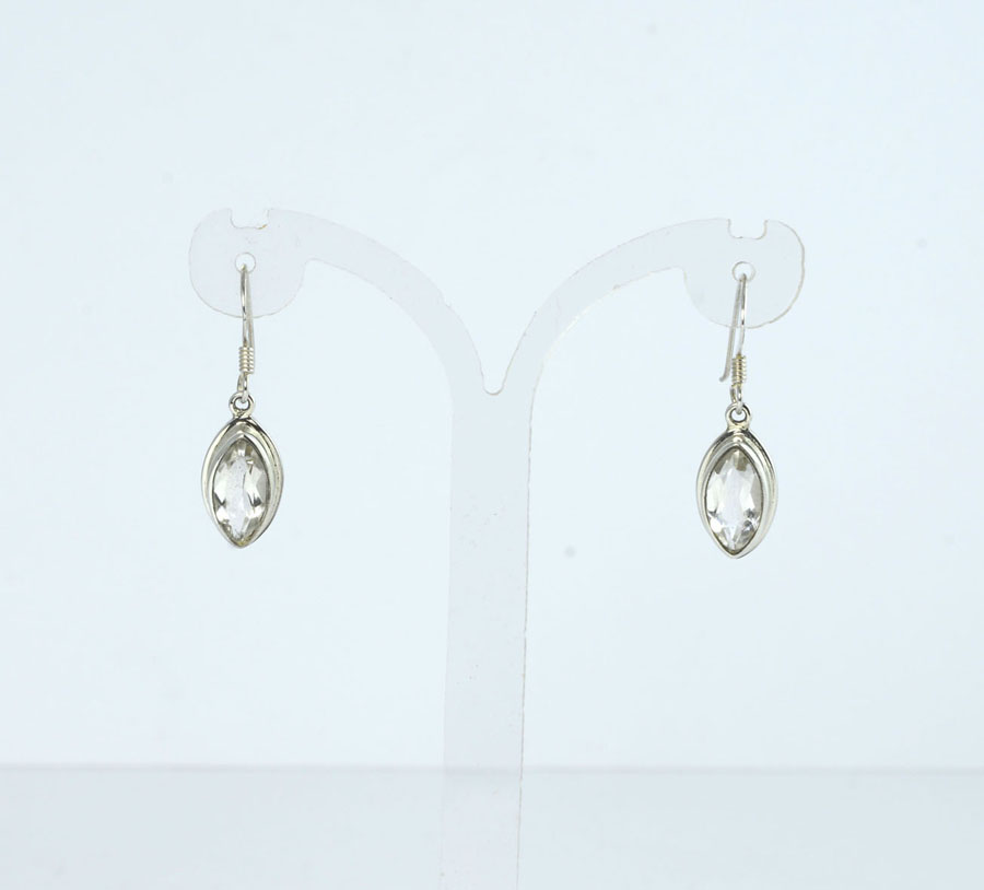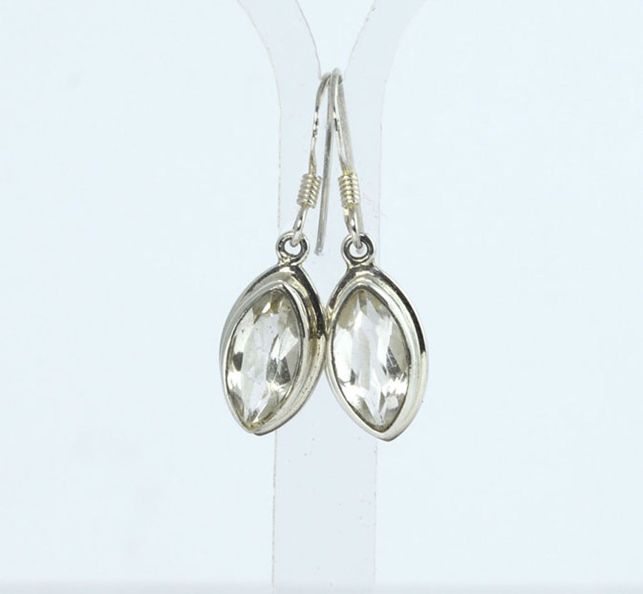 Modern: Bergkristall-Ohrhänger mit navetteförmigen, facettiertem Steinen. Die Bergkristalle sind mit einem breiten Rand in Sterling Silber eingefasst.