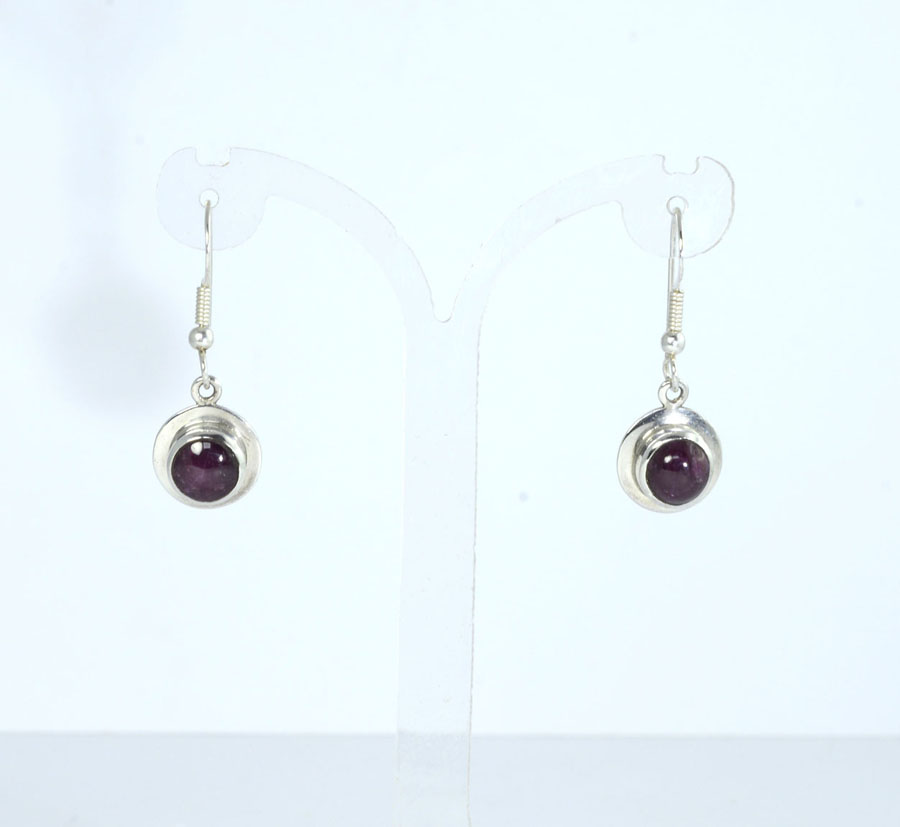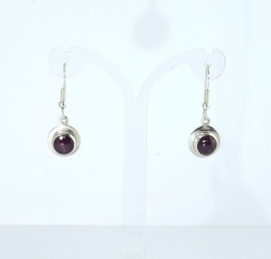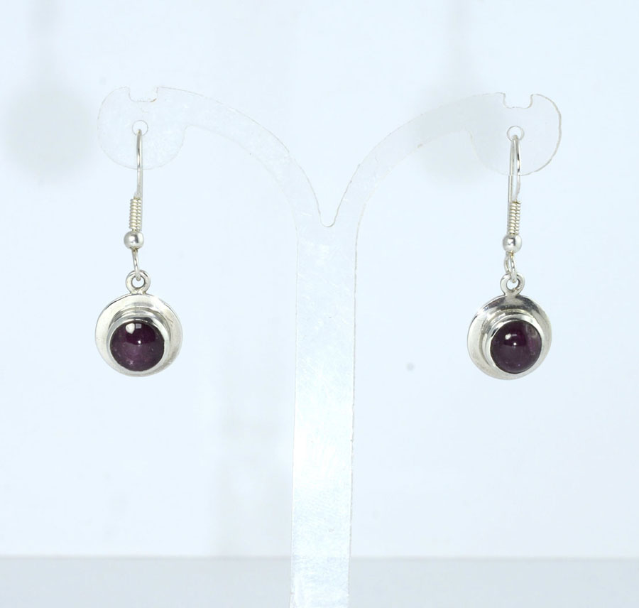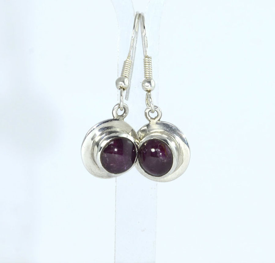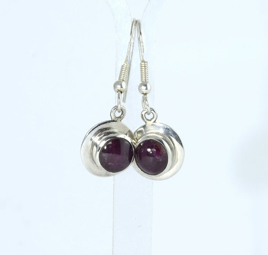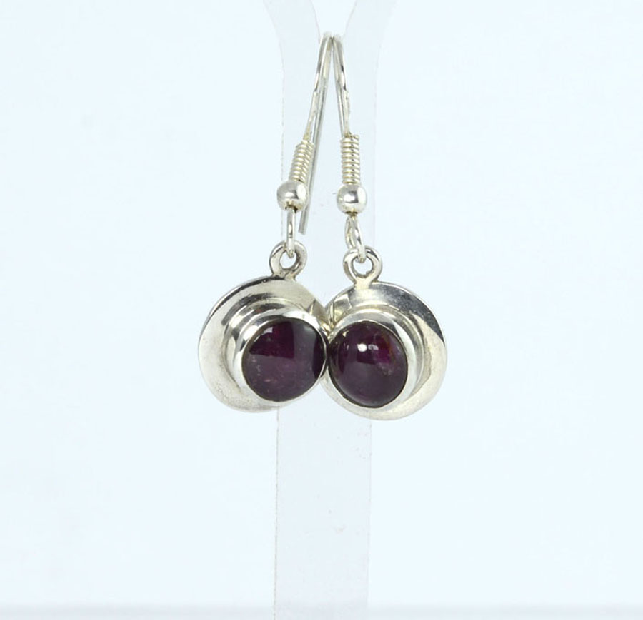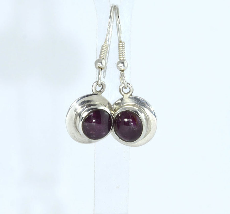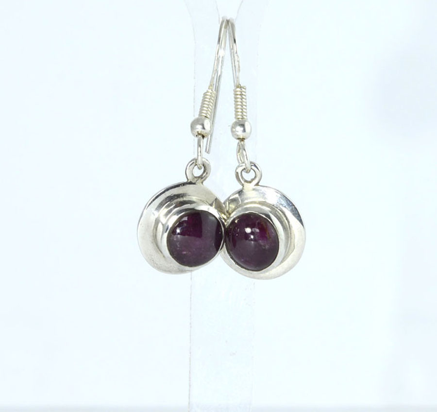 Dunkelrote Stern-Rubin-Ohrhänger mit rundlich-ovalen Cabochons. Die Steine haben einen feinen Sterneffekt und sind mit breitem Rand in Sterling Silber eingefasst. Dieses Paar Stern-Rubin-Ohrhänger ist ein Unikat.