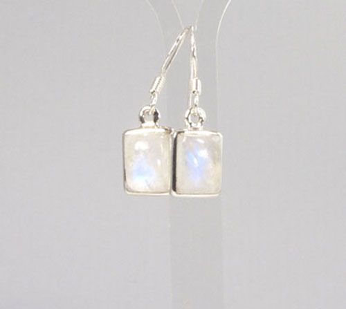 Modern: Weiße Labradorit-Ohrhänger mit zart blau schimmernden, rechteckigen Cabochons. Die Steine sind in Sterling Silber gefasst.