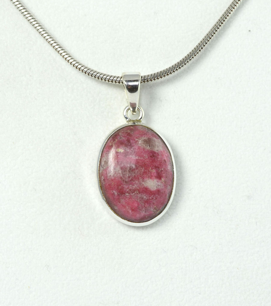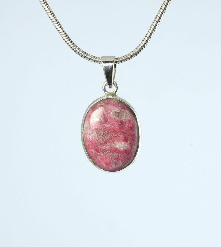 Mittelgroßer Thulit-Anhänger mit leuchtend rosa Farbe und lebendiger Zeichnung. Der ovale Cabochon ist in Sterling-Silber gefasst. Dieser Thulit-Anhänger ist ein Unikat.