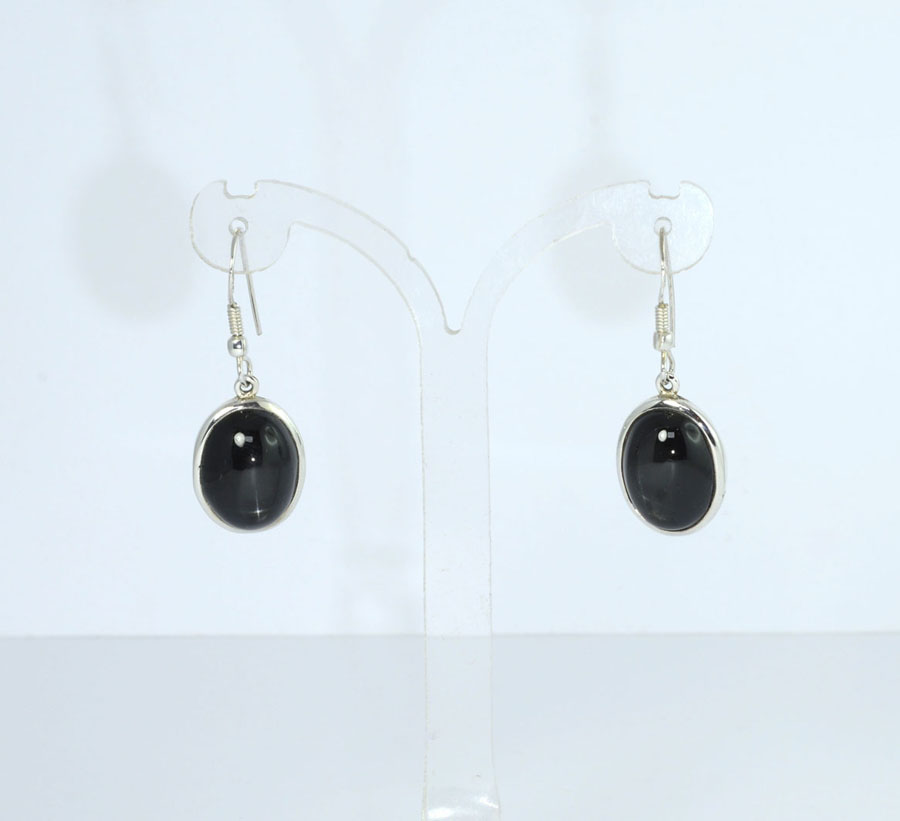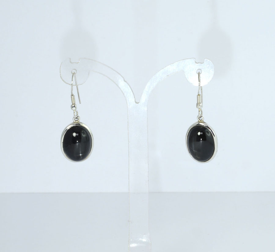 Große Stern-Diopsid-Ohrhänger mit gut sichtbarem Sterneffekt. Die ovalen Cabochons sind in Sterling Silber gefasst. Dieses Paar Stern-Diopsid-Ohrhänger ist ein Unikat.