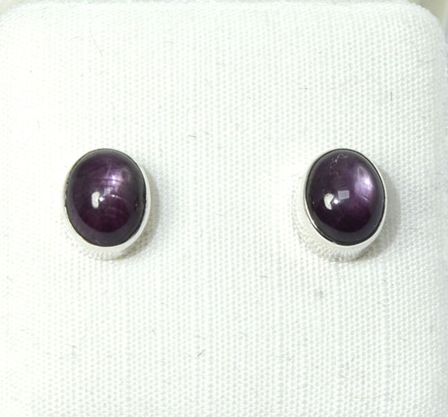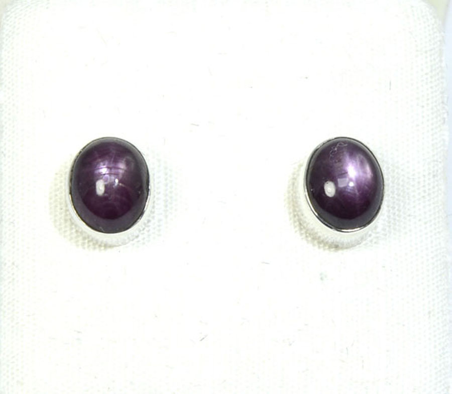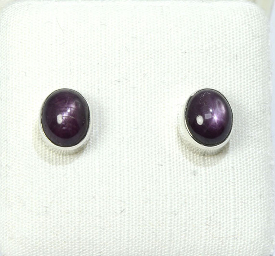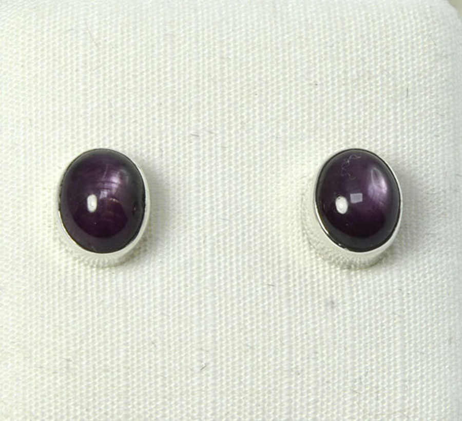 Edle, weinrote Stern-Rubin-Ohrstecker mit ovalen Cabochons. Die Steine haben einen feinen, silbrig schimmernden, Sterneffekt und sind in Sterling Silber eingefasst. Dieses Paar Stern-Rubin-Ohrstecker ist ein Unikat.
