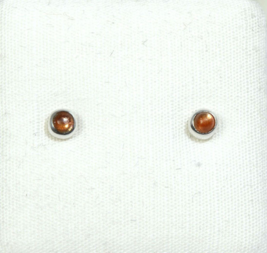 Zierliche, runde Sonnenstein-Ohrstecker mit kupfer-golden leuchtenden Cabochons, die in Sterling-Silber eingefasst sind.