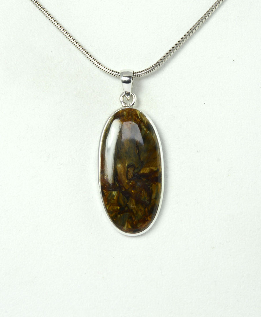 Kettenanhänger mit länglich-ovalem Pietersit-Cabochon. Durch seinen seidigen Schimmer wirkt der fein gezeichnete, überwiegend gold-braune Pietersit sehr edel. Der Stein ist in Sterling Silber gefasst. Dieser Pietersit-Anhänger ist ein Unikat.