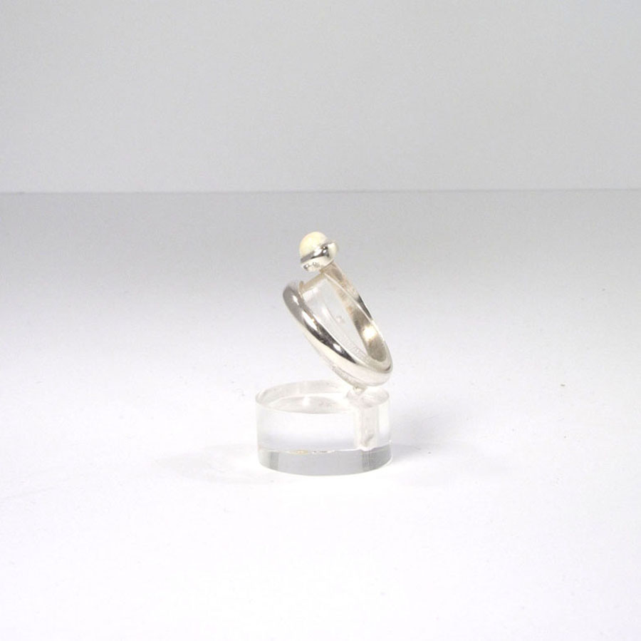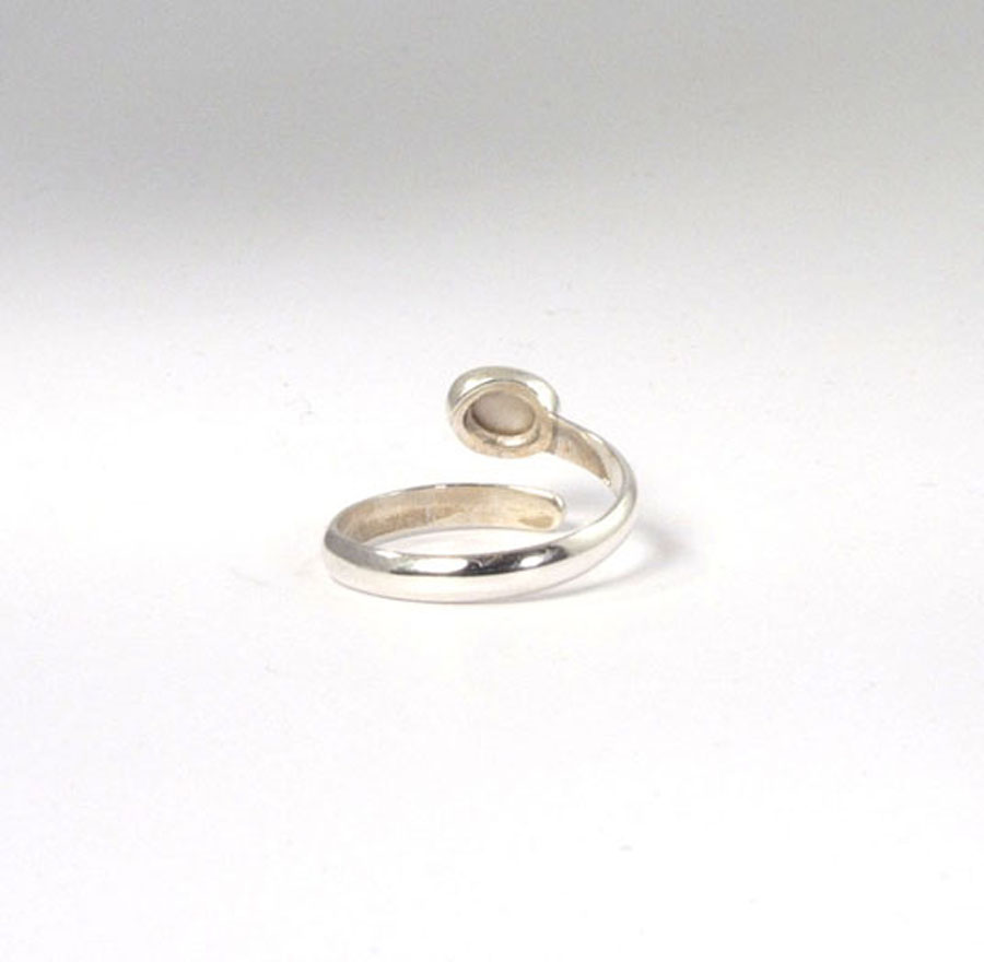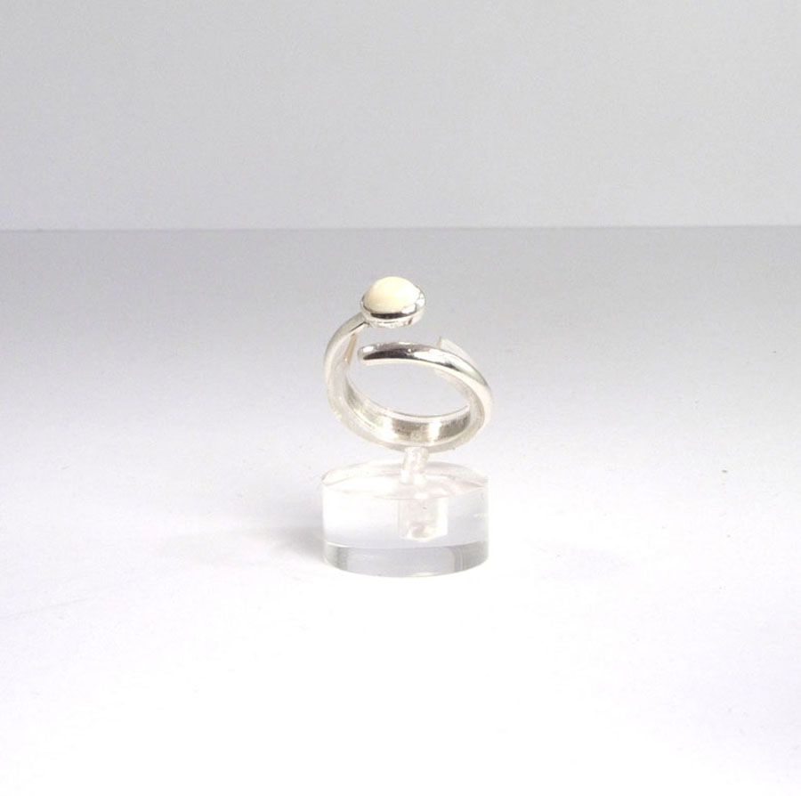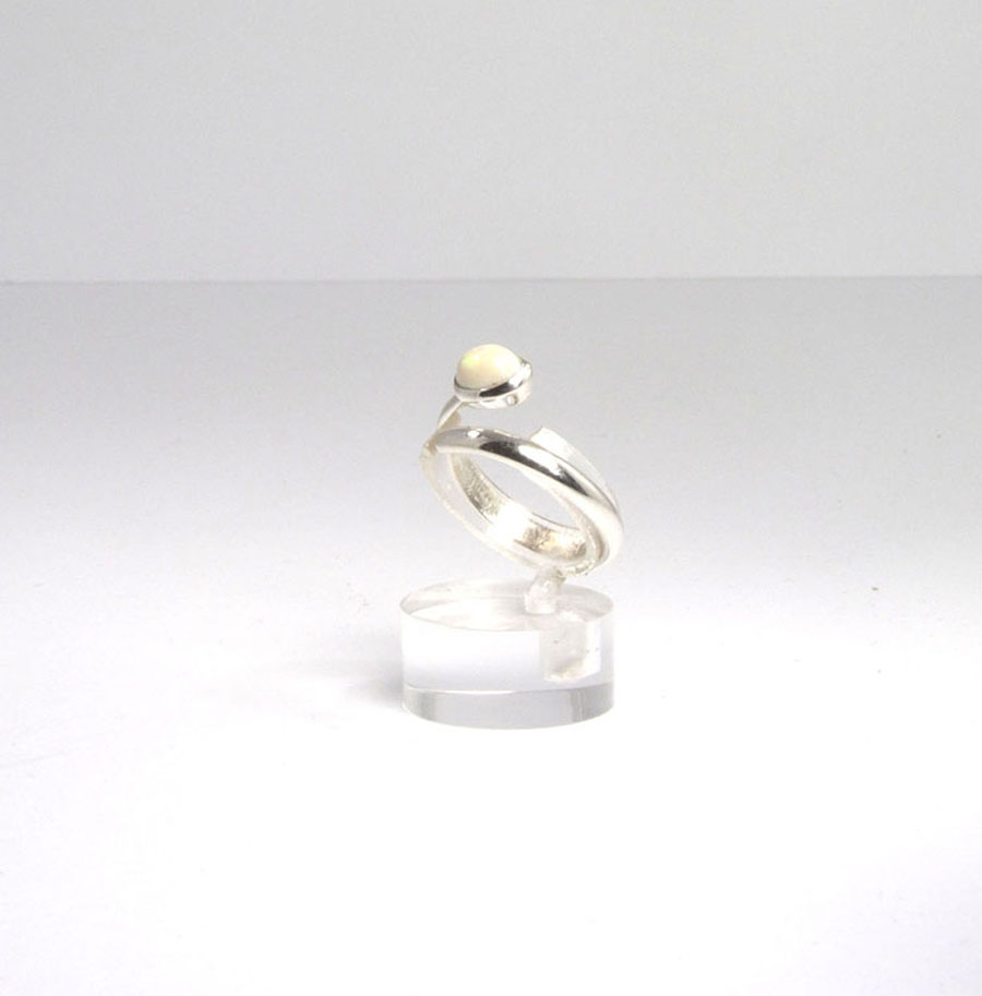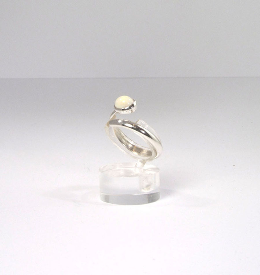 Zierlicher spiralförmiger Ring mit einem kleinen ovalen Edelopal als Cabochon in Sterling Silber. Der Opal hat ein feines, buntes Farbspiel und ist in Sterling Silber gefasst sind.