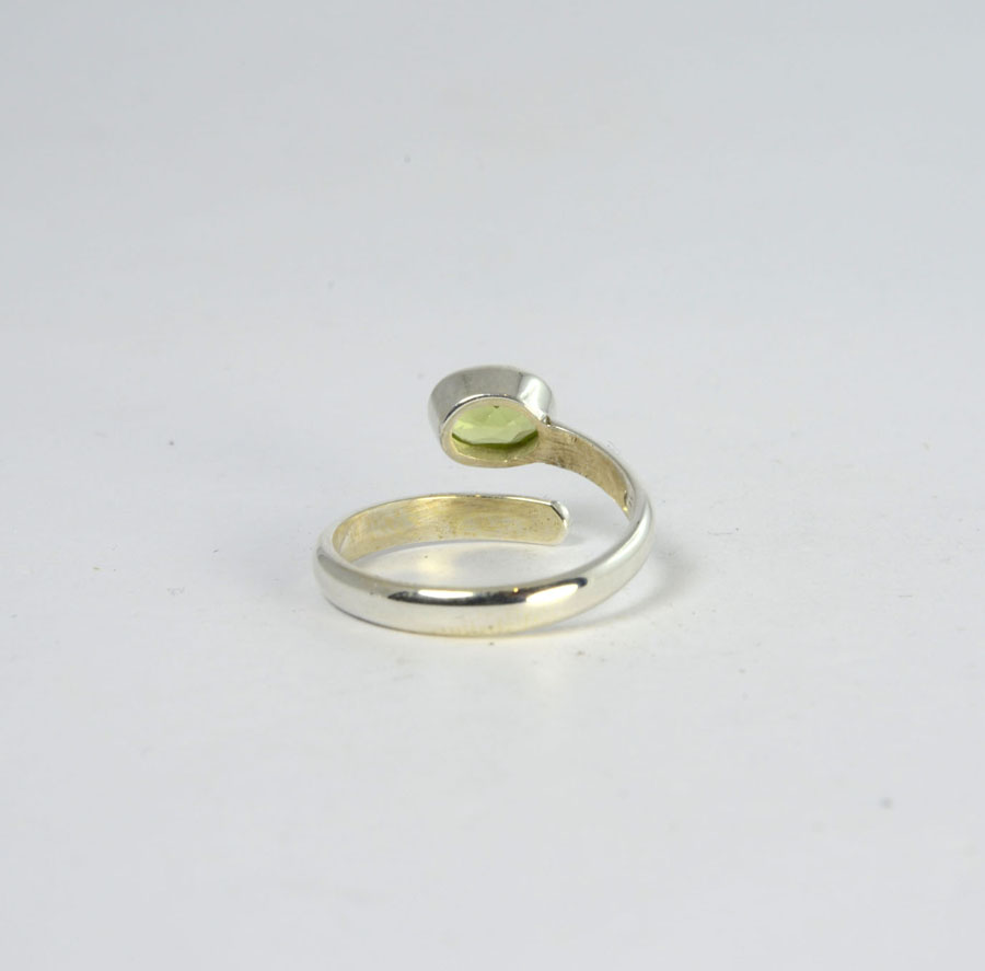 Zierlicher Ring in Spiralform mit einem kleinen ovalen, facettierten Peridot, eingefasst in Sterling Silber.