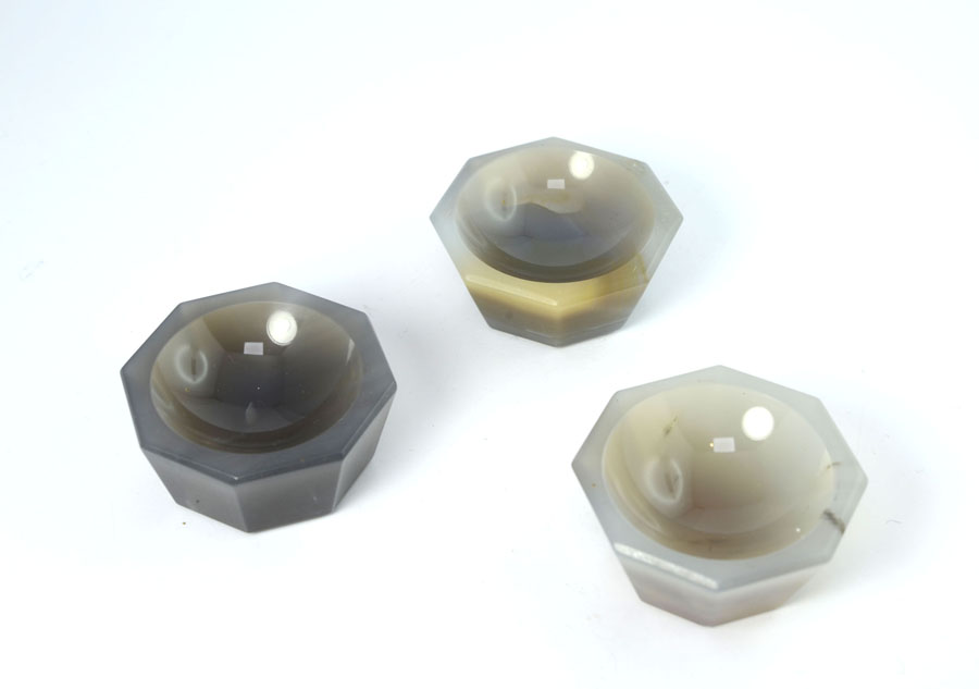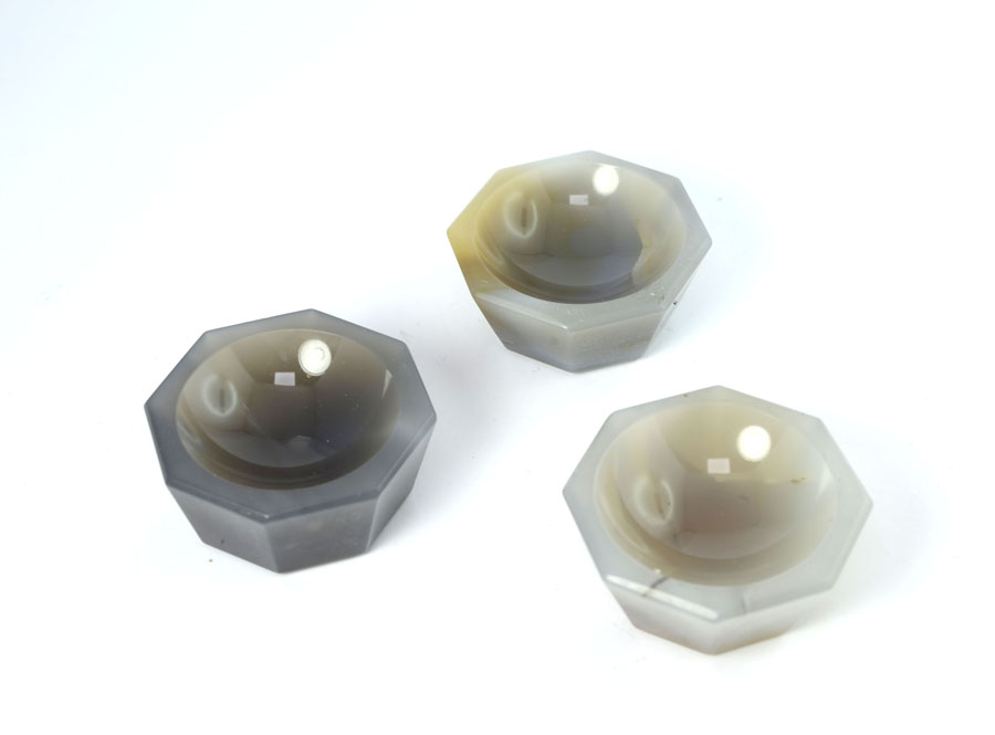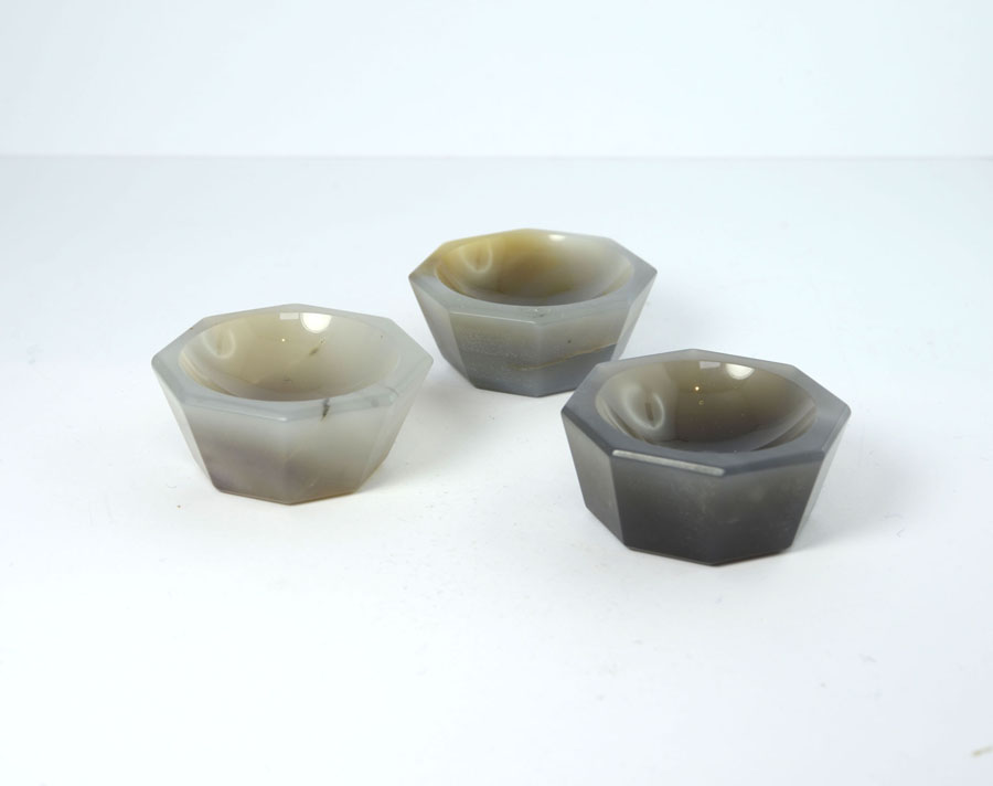 Kleine, sechseckige Schale aus grauem Achat mit feiner Bänderung.